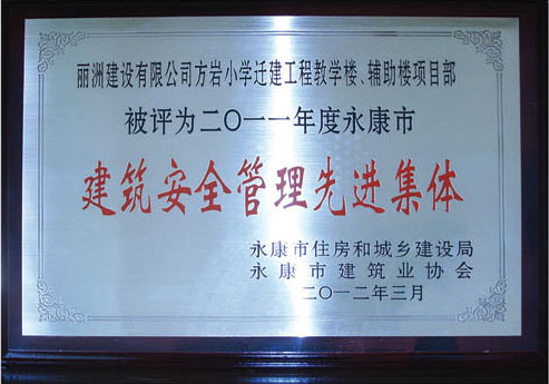 2011年度方岩小学评为永康市建筑安全管理先进集体
