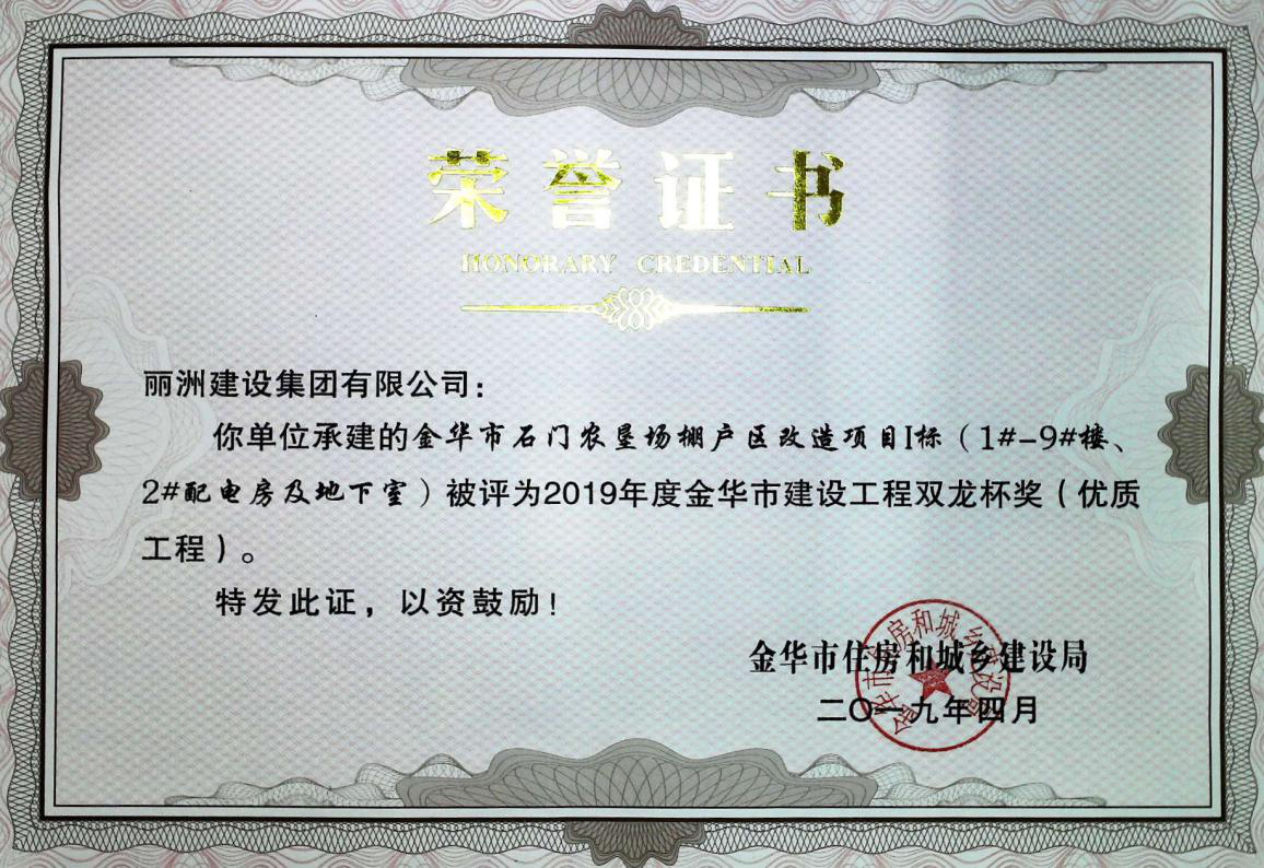 金华石门农垦场棚户区改造项目I标(1#-9#楼.2#配电房及地下室)获金华市建设工程双龙杯奖(优质工程)