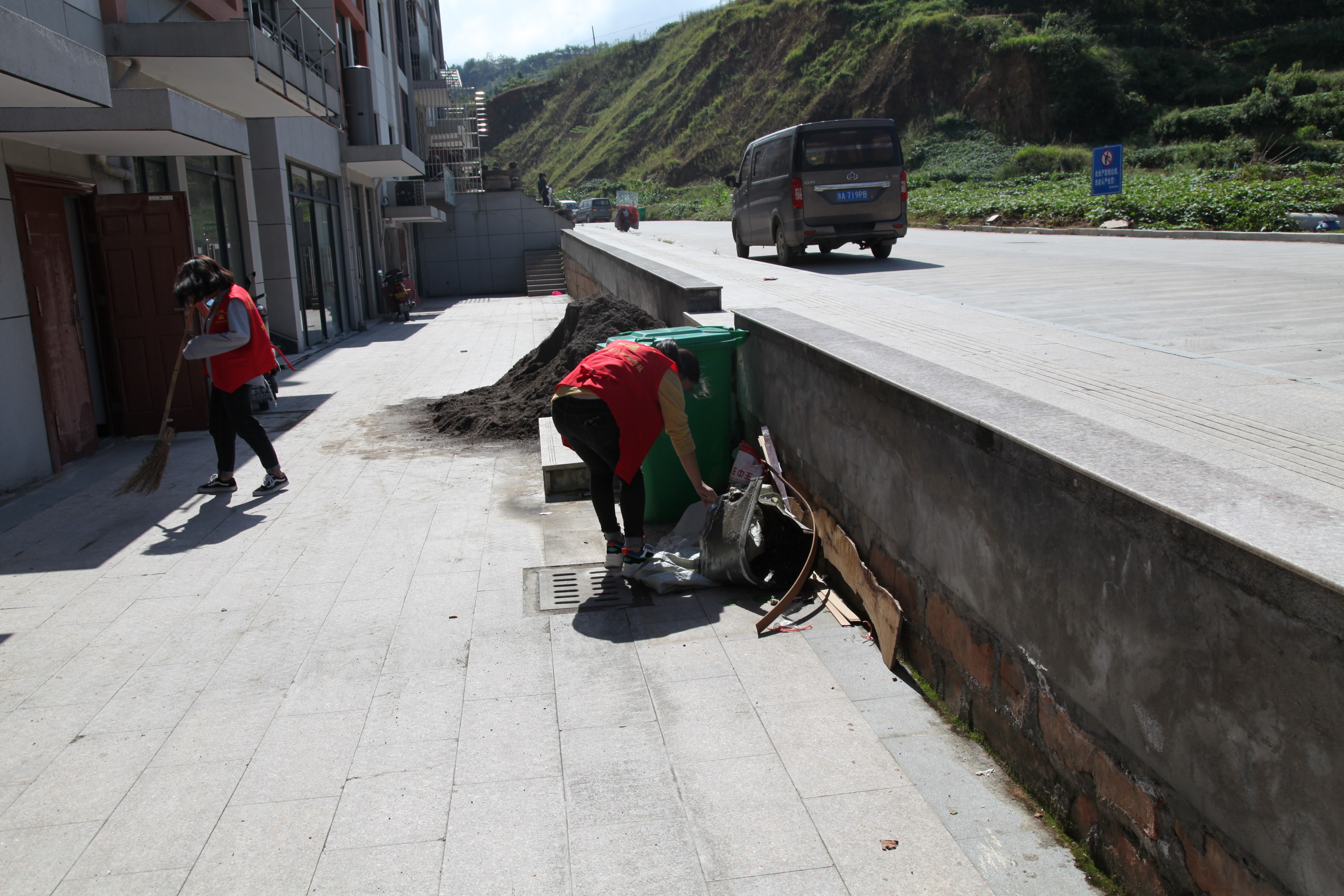 为迎接中华人民共和国成立69周年,9月28日,中共丽洲建设集团有限公司党支部组织党员志愿者对磐安国际建材城内的白色垃圾、堆物、牛皮癣等进行清除。大家有的一手拿着垃圾袋,一手拿着夹子,有的拿着铲子,有的拿着扫把,大家同心协力捡拾白色垃圾,清除小广告,清理卫生死角。大家不怕脏、不怕累,干得热火朝天,使大家拥有一个干净整洁的美好生活环境。经过大家辛勤努力,建材城环境焕然一新,路人纷纷称赞。