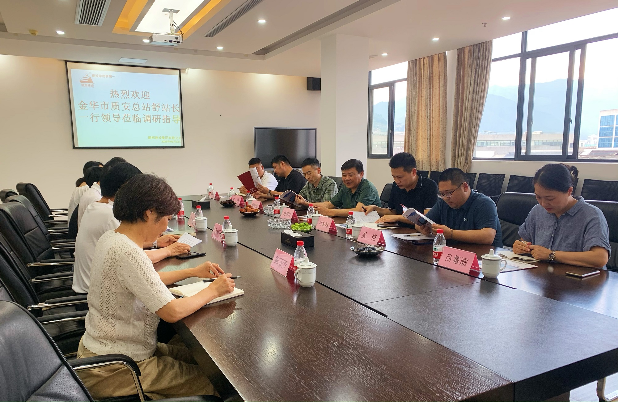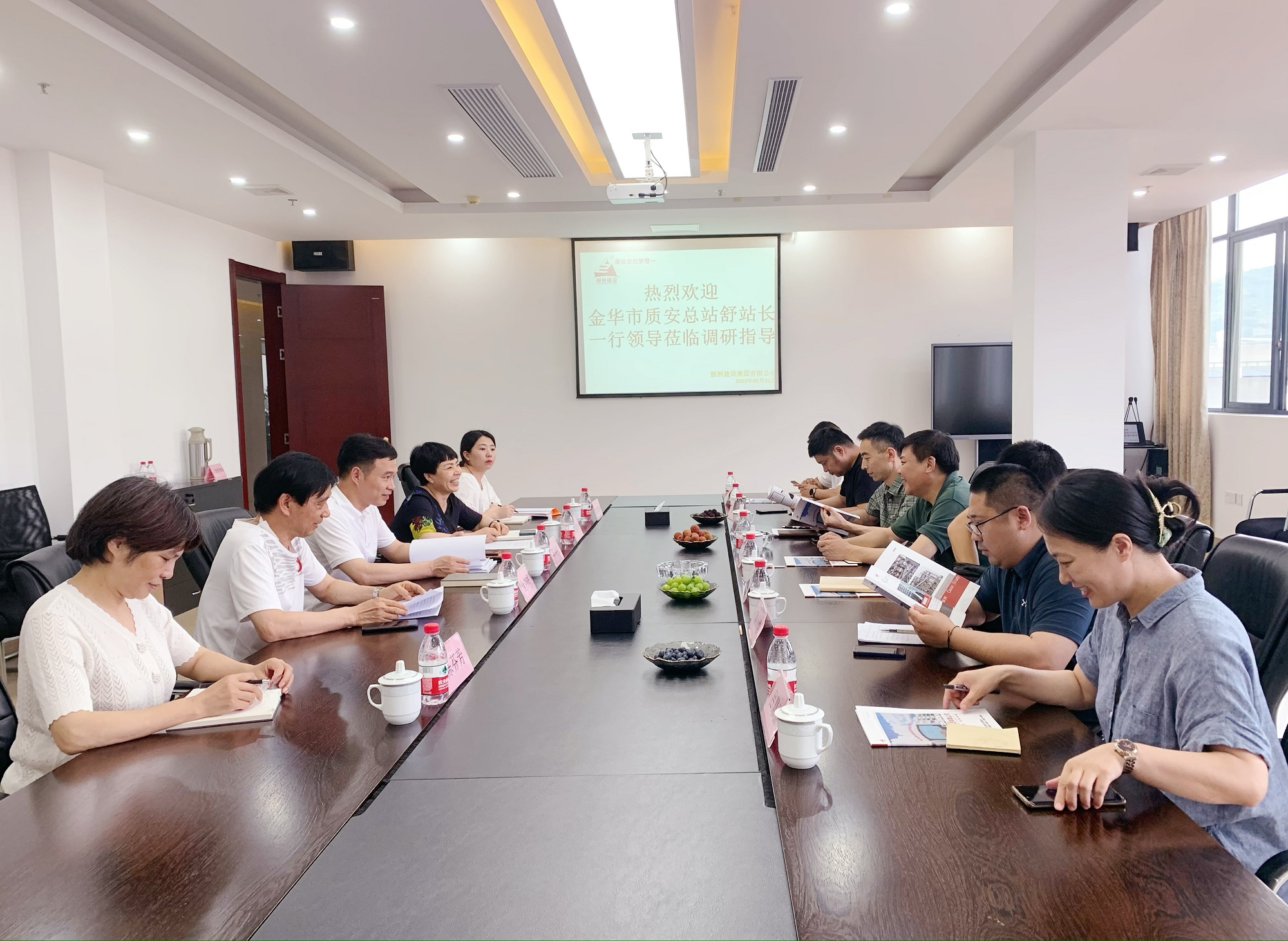 2023年5月31日下午,金华市建设工程质量安全管理总站舒慧斌站长一行3人在县住房和城乡建设局副局长赵振威一行陪同下赴我司就企业发展情况进行调研。公司董事长陈金宝、执行总裁金裕民、副总裁陈萍华、各部门相关人员参加本次调研。