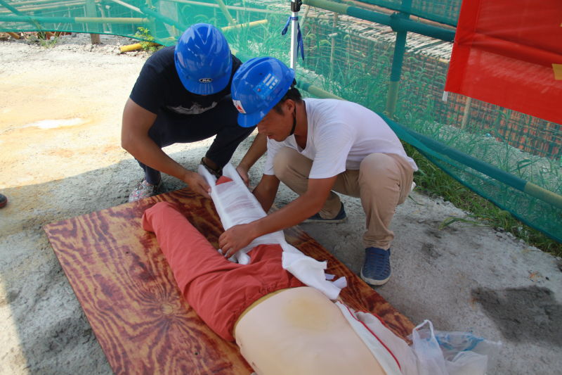 上午8点30分,由丽水人民医院急救科三位专家组成的专家组,在项目部民工学校,对各部门参加演练人员进行了急救知识的培训。上午9点30分,一名建筑工人在厂区办公楼地下室通道旁高处作业时不慎坠落到地面,现场安全员发现这一情况后立即向现场指挥组报告,指挥组接到报告后,立即指挥应急救援小组、安全保卫组、通迅保障组启动应急预案,并拨打丽水市120电话求援。现场各小组根据应急预案、职责分工,迅速拉开警戒线展开事故现场保护,疏散相关人员,并对伤者采取包扎止血,夹板固定骨折部位等急救措施。随后救护车到场,救援医生对伤者做进一步检查,对受伤部位做进一步简单处理后,应急救援人员协助医生把受伤人员转移到救护车上,救护车驶向丽水市人民医院。