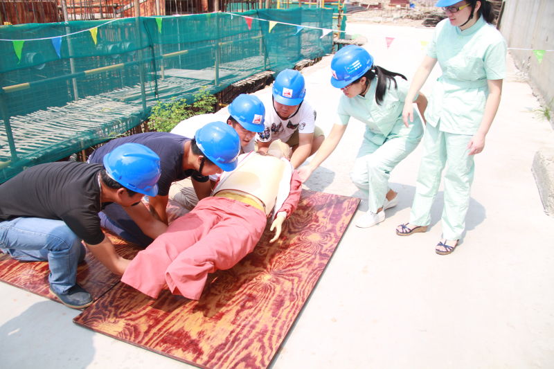 应急演练以“工人在地下室通道旁高处坠落事故”为背景,由项目经理刘剑东为组长,技术负责人秦卸华为副组长,项目部管理人员及项目各班组长为组员,分为指挥组、救护组、安全保卫组、通讯保障组、善后处理组等。为进一步增强建筑工地安全生产意识,提高对建筑施工现场突发事故的实战能力。2016年6月23日上午,我公司联合丽水市人民医院,在浙江江南景洁铝业厂房工程项目部组织开展了建筑工地高处坠落事故应急演练及急救知识现场培训。