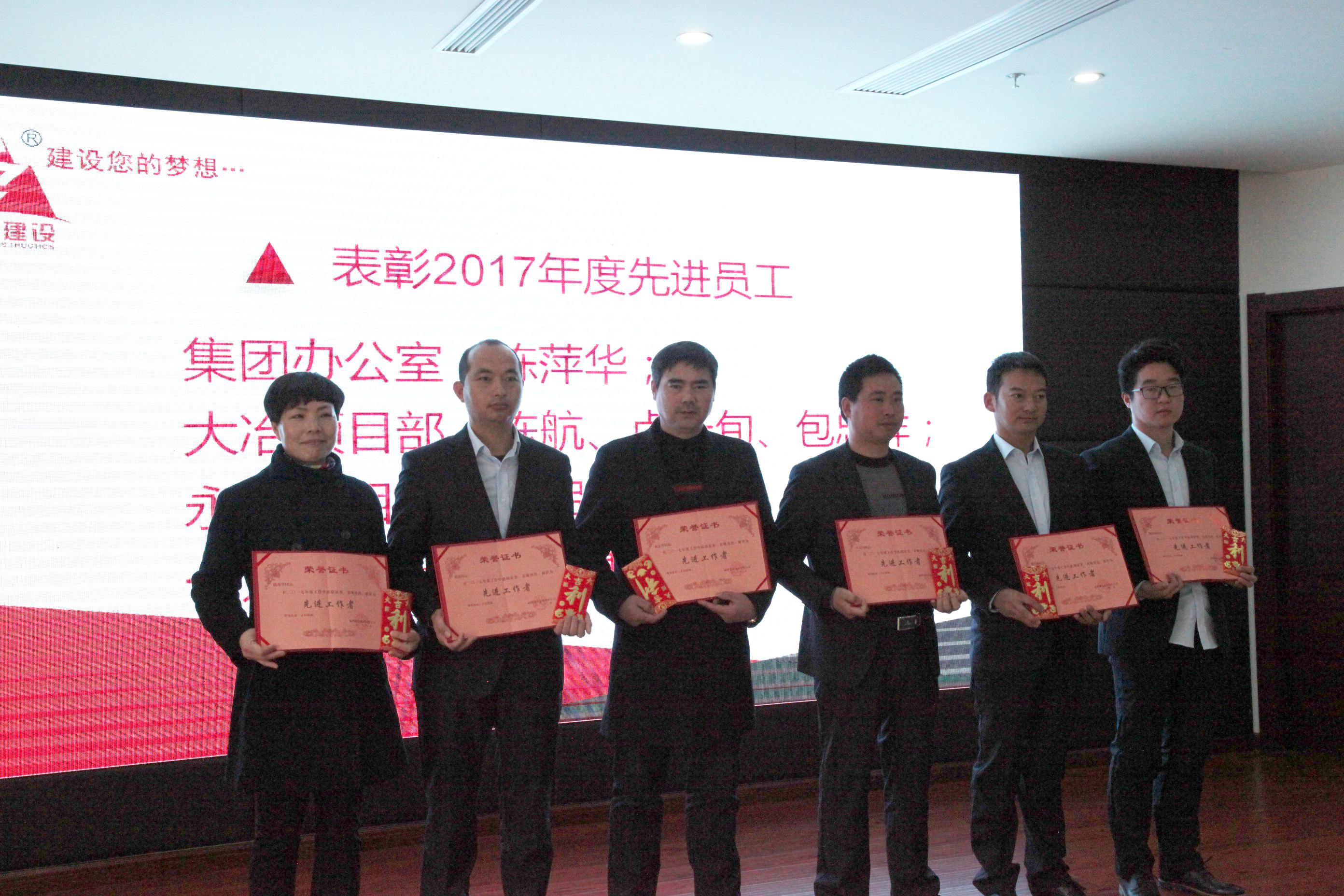 会议议程二:表彰2017年度先进员工并发放荣誉证书;受到表彰的有集团公司经营部陈萍华,大冶汉龙汽车项目部陈航、卢天旬、包忠祥,永康项目部董启流、一方项目部陈康康。