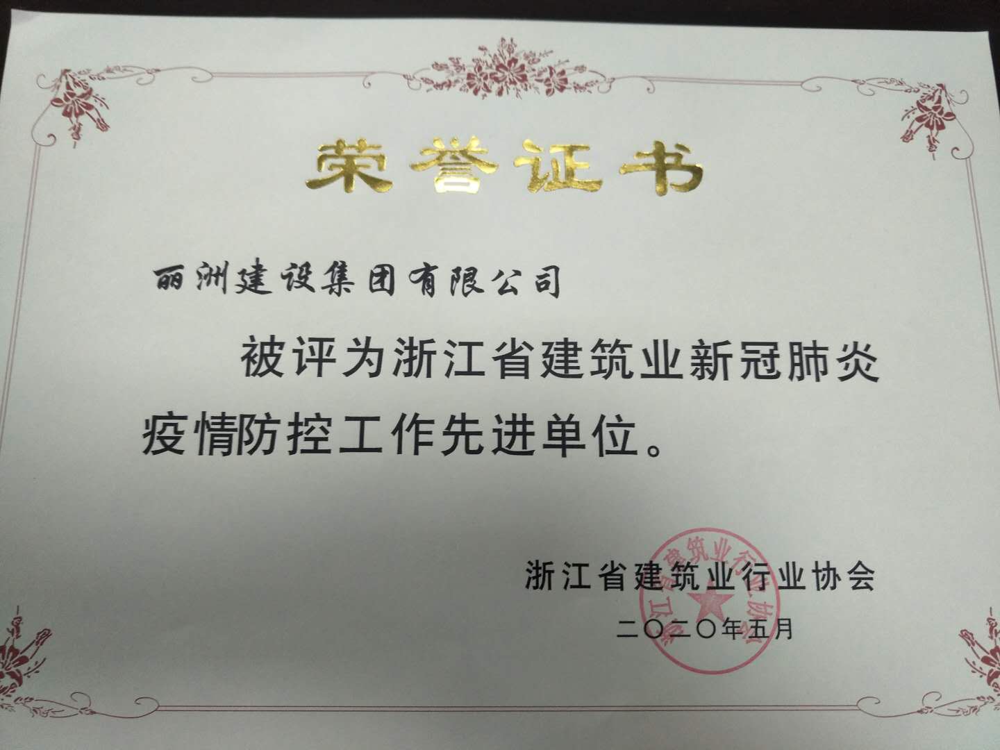 在本次会议上,我公司被浙江省建筑业行业协会授予“2020年度疫情防控先进单位”和“2019年度浙江省建筑业先进企业”荣誉,同时,公司项目经理郭郎君获得“2019年度浙江省优秀项目经理”称号。